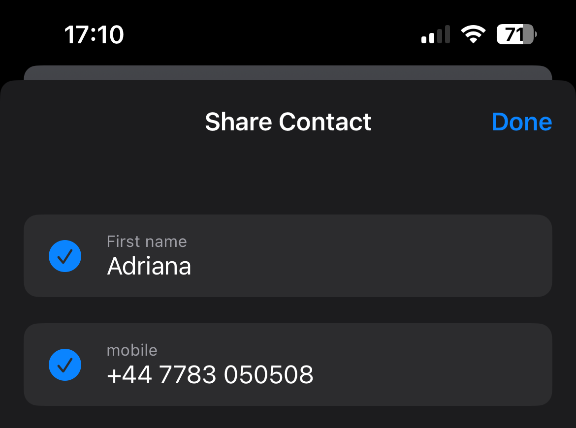 - Revise los datos de la tarjeta de contacto una última vez y, a continuación, pulse Hecho para compartirlo.
