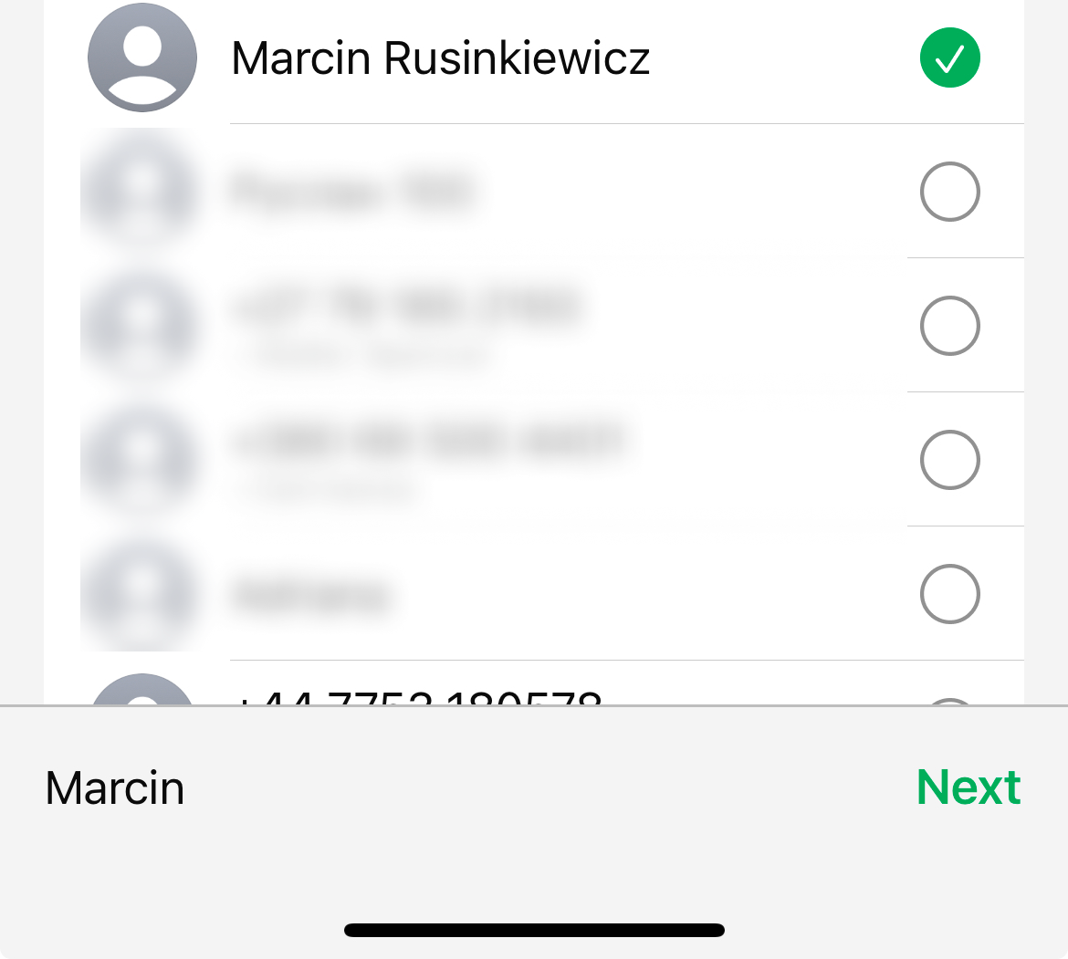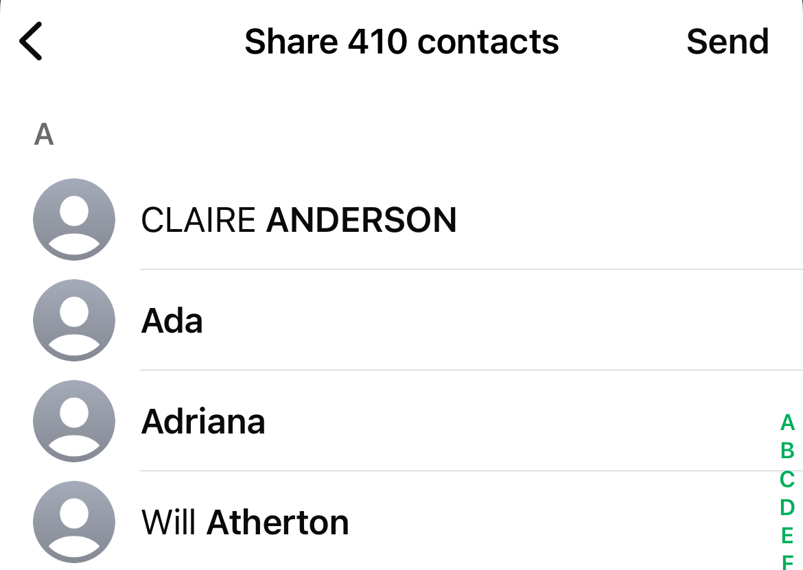 - Aparecerán tus contactos y chats de WhatsApp. Seleccione la persona o el grupo con el que desea compartir el contacto tocando su nombre. Una vez seleccionado, pulse el botón Enviar icono (la flecha verde).