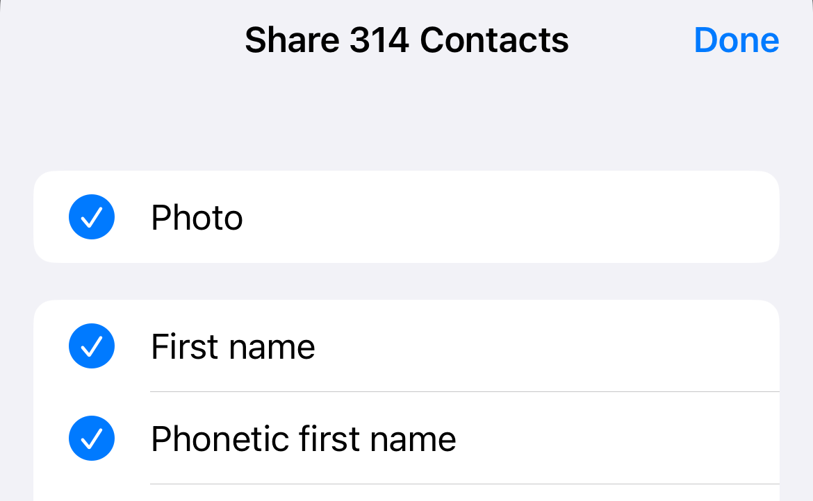 - Revise los datos de contacto que se incluirán, anule la selección de los que no desee compartir y pulse Hecho para generar el archivo de contactos.