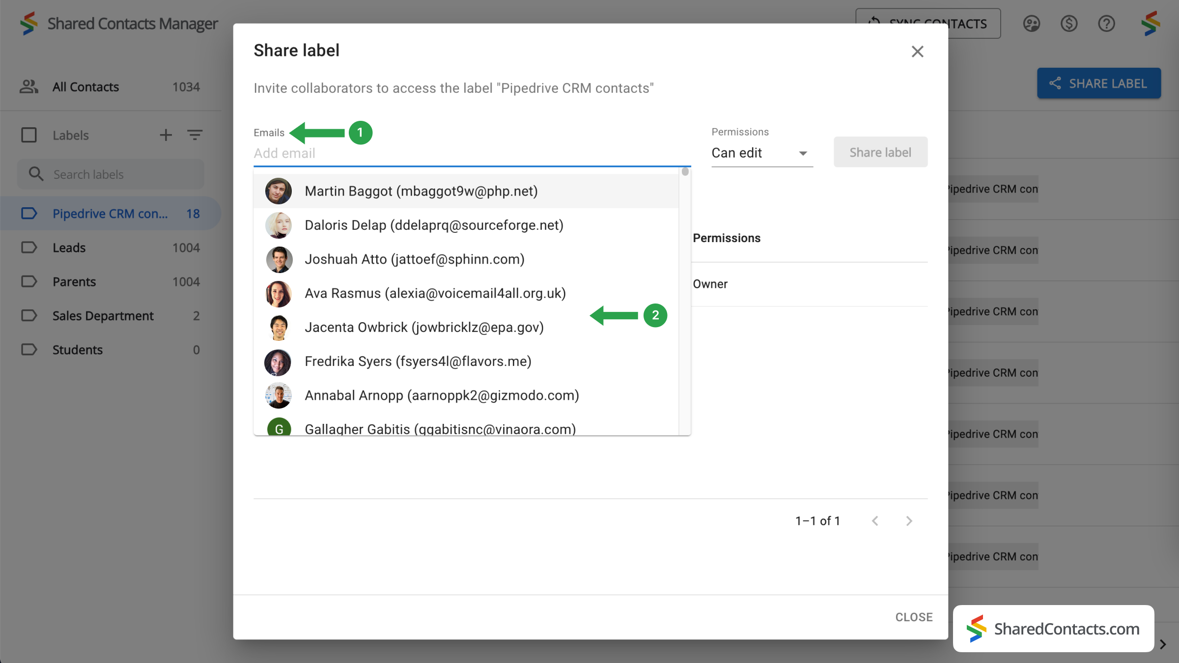 In the left sidebar, you will find the ‘Pipedrive CRM contacts’ label you have created in your Google Contacts and connected with the CRM earlier. Select this label and you’ll see all your contact data from Pipedrive here in the Shared Contacts Manager’s dashboard, ready to be shared with your team members who need access to these contacts.