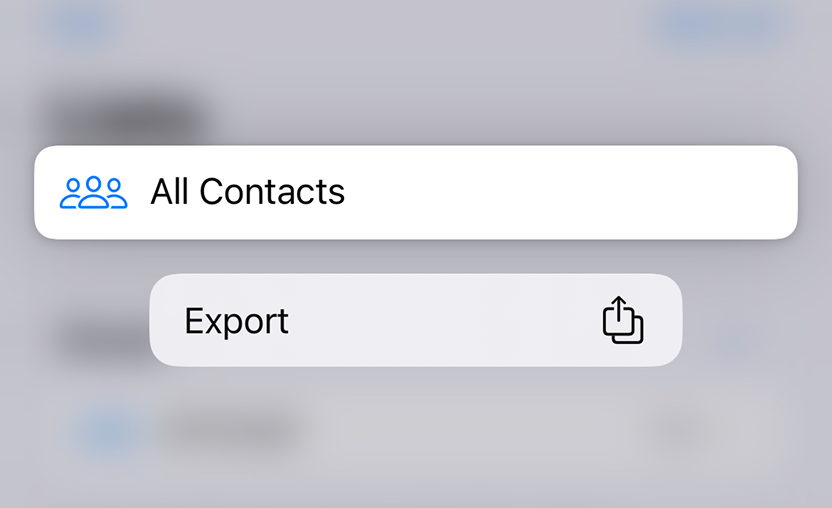- iPhone과 동기화된 계정이 몇 개 있는 경우 특정 계정을 선택합니다(예: iCloud, Gmail). 모든 연락처. 를 길게 누른 다음 내보내기.