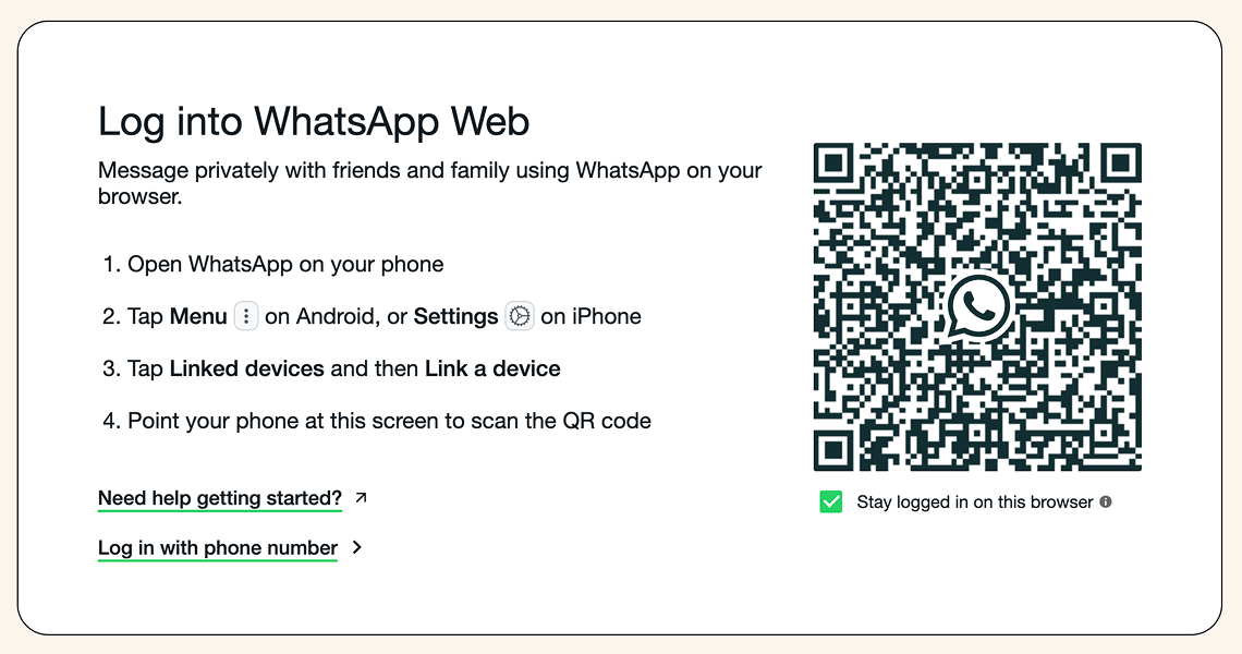 - 在手机上打开 WhatsApp 应用程序,转至 设置 > 已链接设备然后扫描电脑屏幕上显示的 QR 代码。