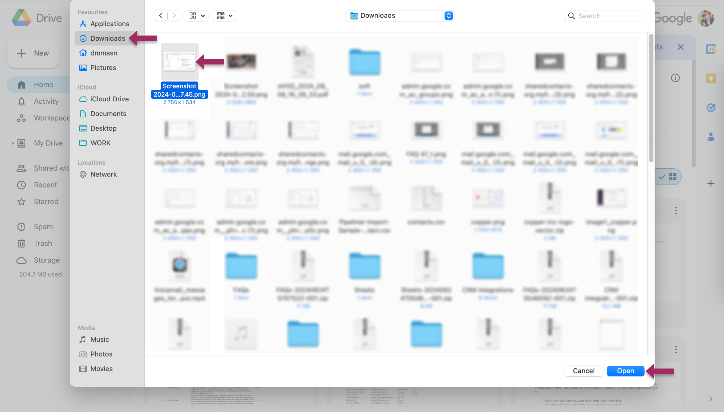 - 找到刚从 iCloud 下载的文件,选中它们,然后点击 开放.
