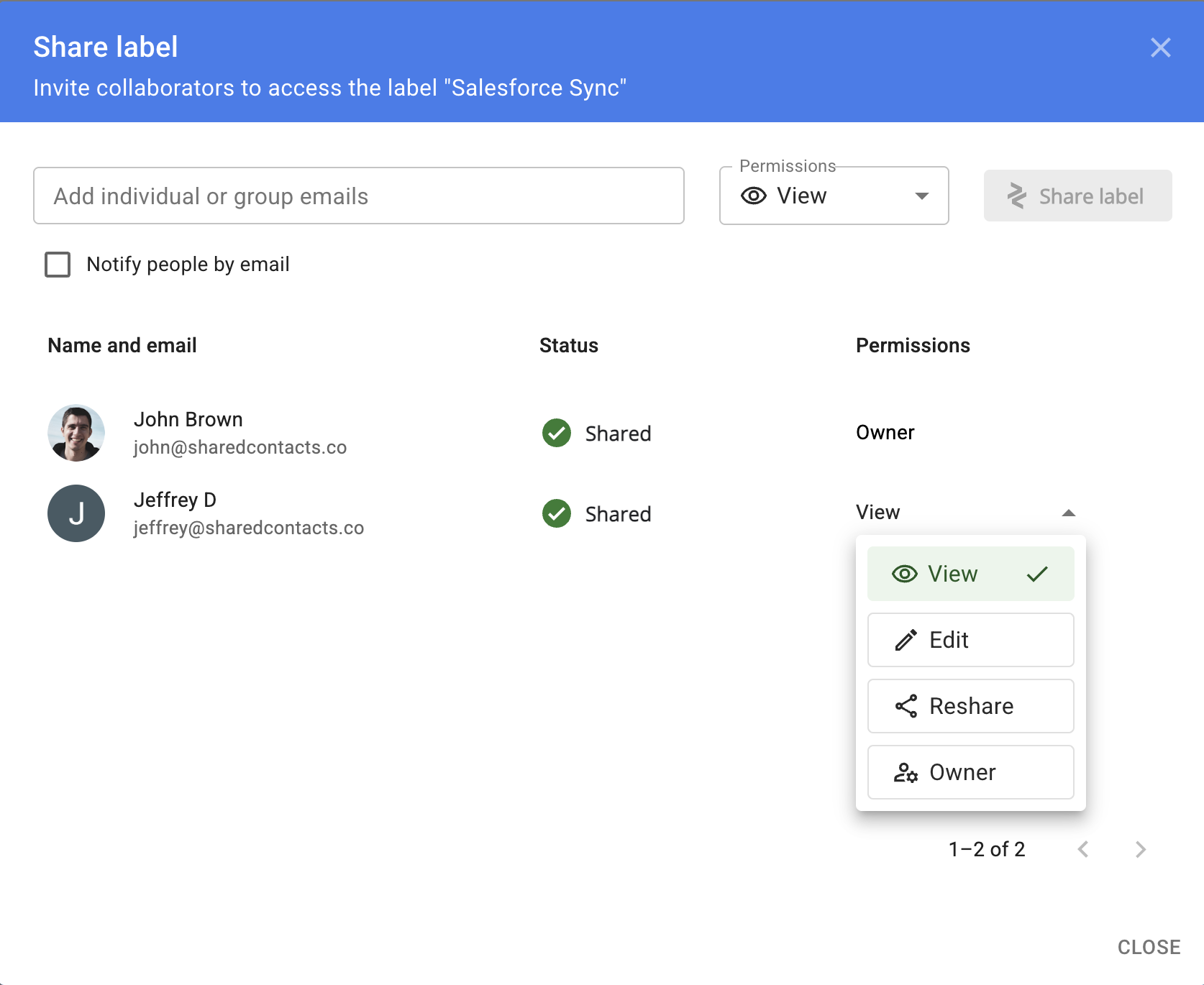 Shared Contacts Manager 最有价值的功能之一是使用标签共享整个联系人组。标签是组织联系人的一种直观方式--例如,将客户、团队成员或供应商分组。有了这个工具,您就可以轻松地与同事或域外的任何人共享这些组。
